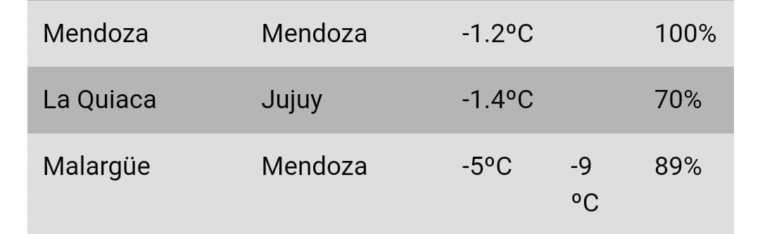 La ciudad de Malargüe amaneció con gélidas temperaturas, tal es así que se ubicó como la ciudad más fría del país. En este sentido, según el registro de la hora 7, la temperatura llegó a los 5°C bajo cero y 9°C bajo cero de sensación térmica.