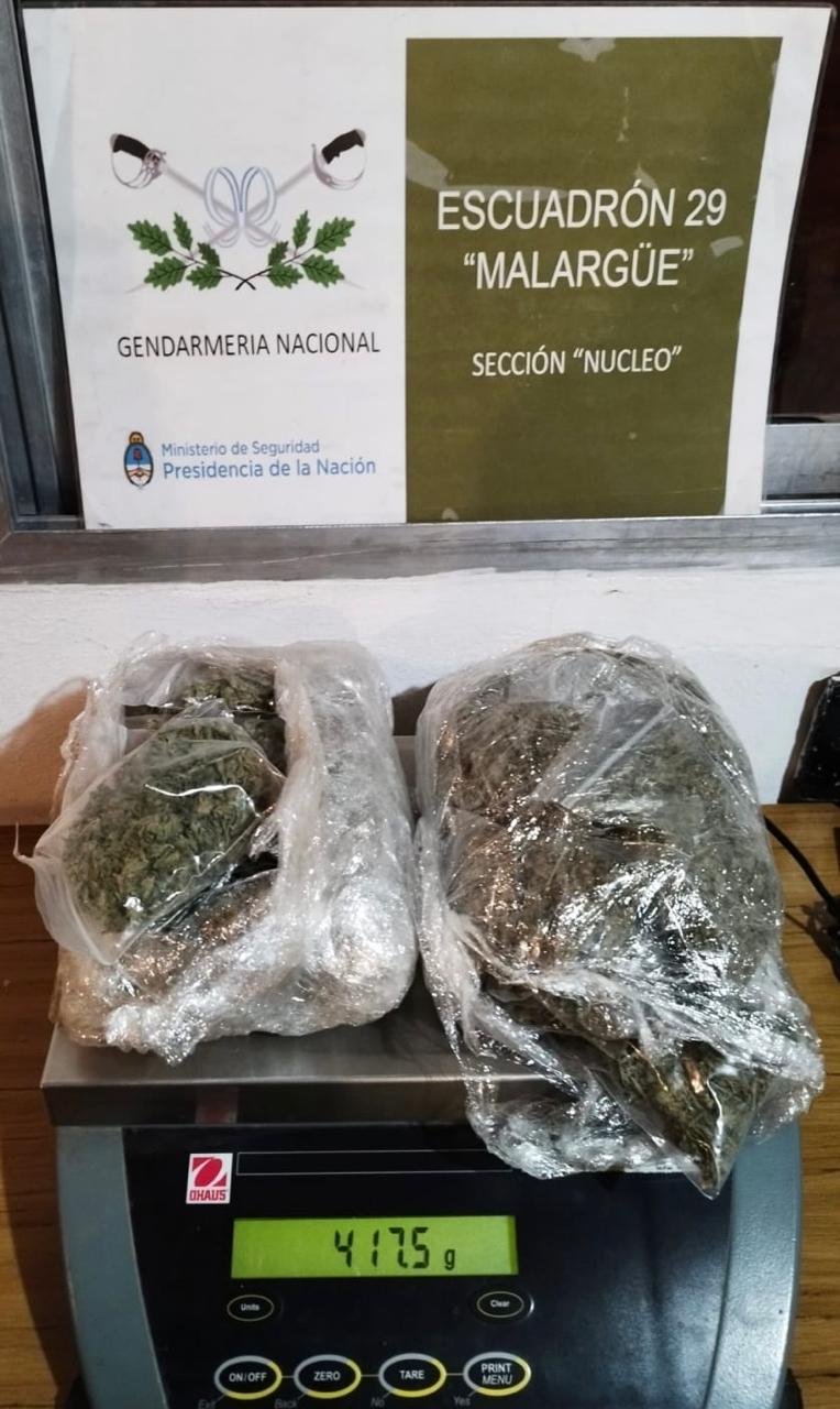 Durante la requisa y ante la reacción del perro antinarcóticos “Mambo”, los uniformados decomisaron 26 bolsas que estaban ocultas en el sector trasero del rodado con 417 gramos de marihuana, según informaron desde Gendarmería Nacional a Malargüe a Diario.