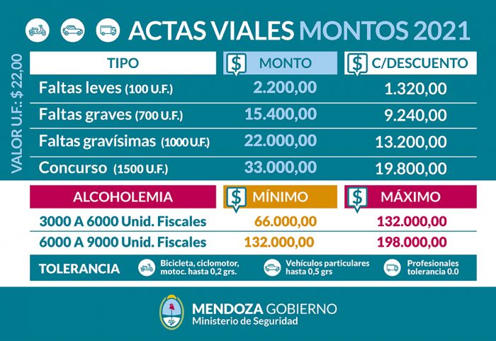 De esta manera, por el plazo de un año, las multas leves cuestan 2.200 pesos (100 UF), las graves 15.400 (700 UF), las gravísimas 22.000 pesos (1000 UF) y el concurso –cuando el conductor comete dos o más faltas– tiene un valor de 33.000 pesos (1.500 UF).