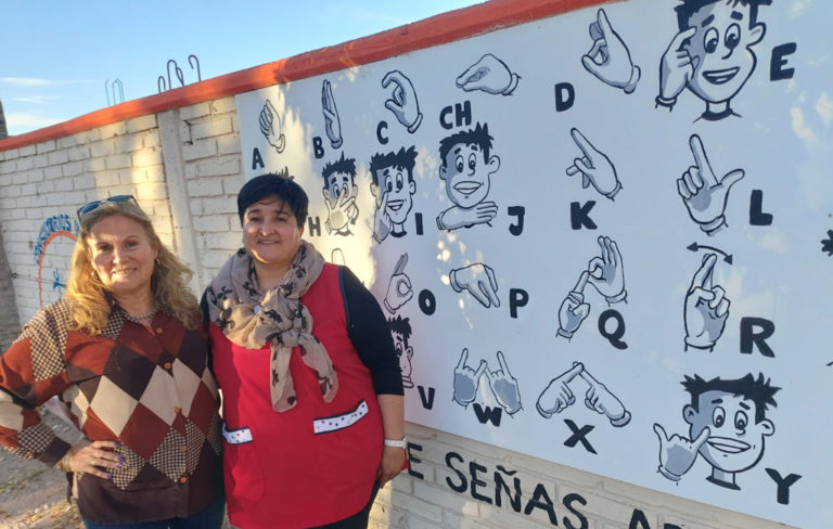 Mariela Villegas es profesora de sordos, terapeuta del lenguaje e integrante de Consultorios Integra2 e informó de qué se trata el mural que se ha plasmado, recientemente, en una de las paredes que dan al exterior: “Pintamos el alfabeto en lengua de señas, se llama lengua de señas dactilológica, que es deletrear con las manos, la cara y el resto del cuerpo nuestro abecedario; se usa solamente cuando se describen nombres de personas y nombres de objetos nuevos pero la lengua de señas en sí es otra cosa, tiene otra articulación, otra gramática, cambia en el sentido que en la señas se formulan ideas globales para que las personas sordas puedan entender lo que estamos hablando”.