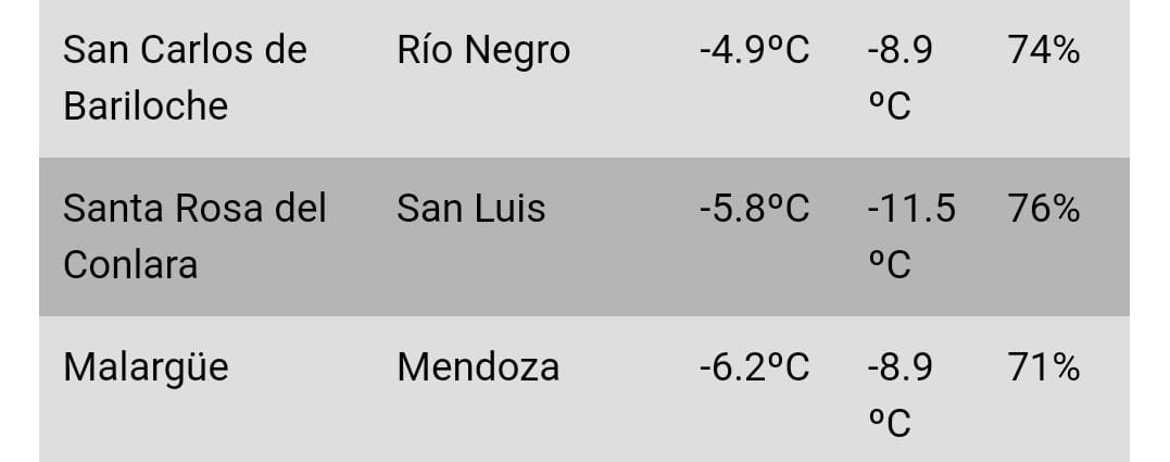 Con esa temperatura, Malargüe se ubicó como la ciudad más fría del país, en tanto que la segunda fue Santa Rosa del Conlara con 5.8°C bajo cero y 11.5°C bajo cero de sensación.