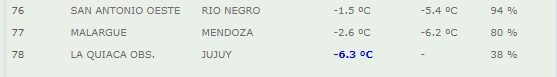 Con esta temperatura Malargüe es la segunda ciudad más fría, siendo la primera La Quiaca, en Jujuy, con 6.3 °C bajo cero.