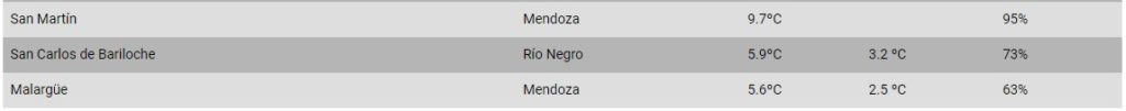 Sin embargo esta jornada de martes amaneció con gélidas temperaturas. Tal es así que según el registro de la hora 7 la temperatura en nuestra ciudad fue de 5.6°C y 2.5°C de sensación térmica. Con este registró, según el ranquin del Servicio Meteorológico Nacional, Malargüe es la ciudad más fría del país.