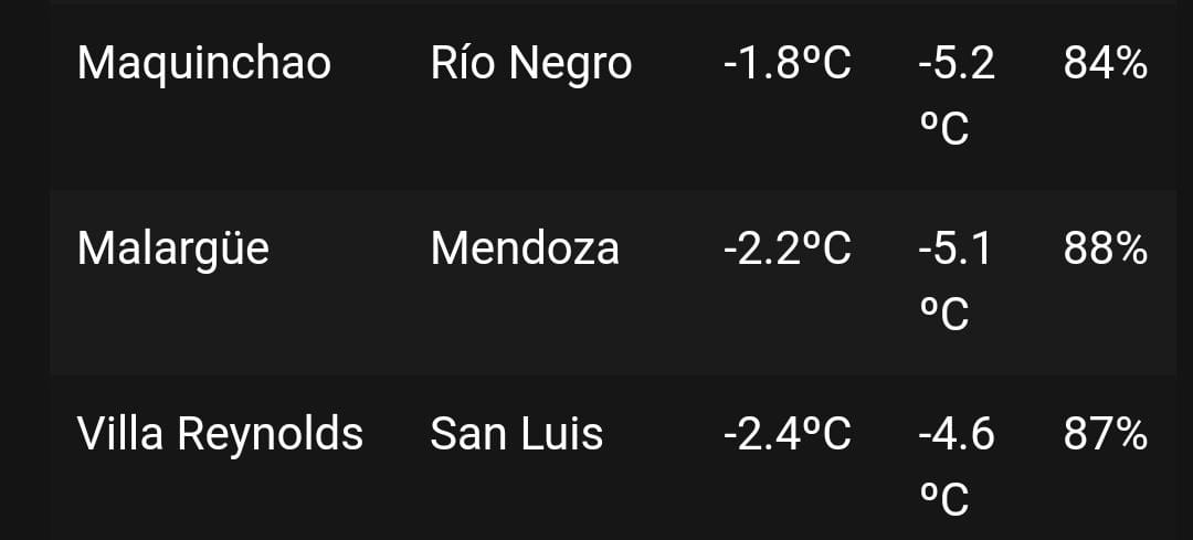 Luego de la nevada en cordillera, ingresó un frente frío y el mismo no pasa desapercibido aquí en la ciudad. Tal es así que según los datos del Servicio Meteorológico Nacional, en su registro de la hora 7, la temperatura en Malargüe es de -2.2°C y -5.1°C de sensación térmica. Con esta temperatura Malargüe se ubica como la segunda ciudad más fría del país.
