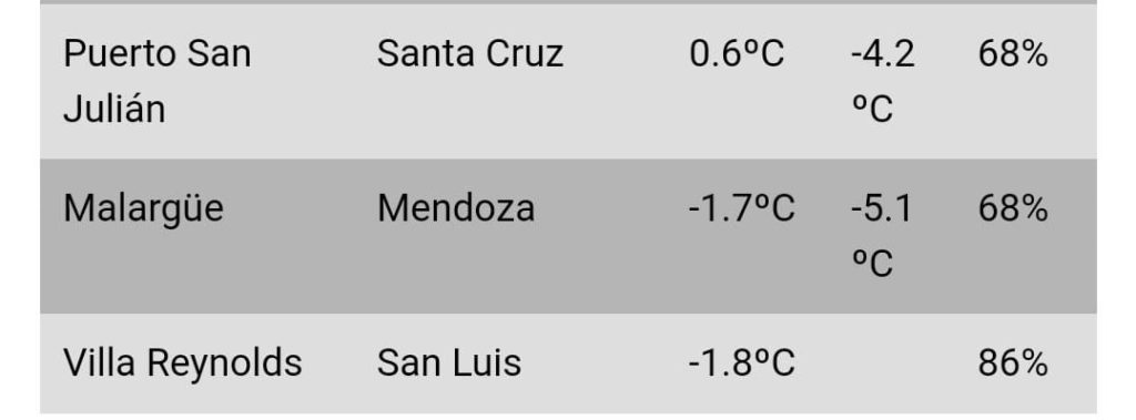 La ciudad de Malargüe amaneció nuevamente con gélidas temperaturas. Tal es así que según el registro de la hora 6 el termómetro marcó 1.7°C bajo cero y 5.1°C bajo cero de Sensación Térmica. Con estos números Malargüe se ubicó como la segunda ciudad más fría del país.