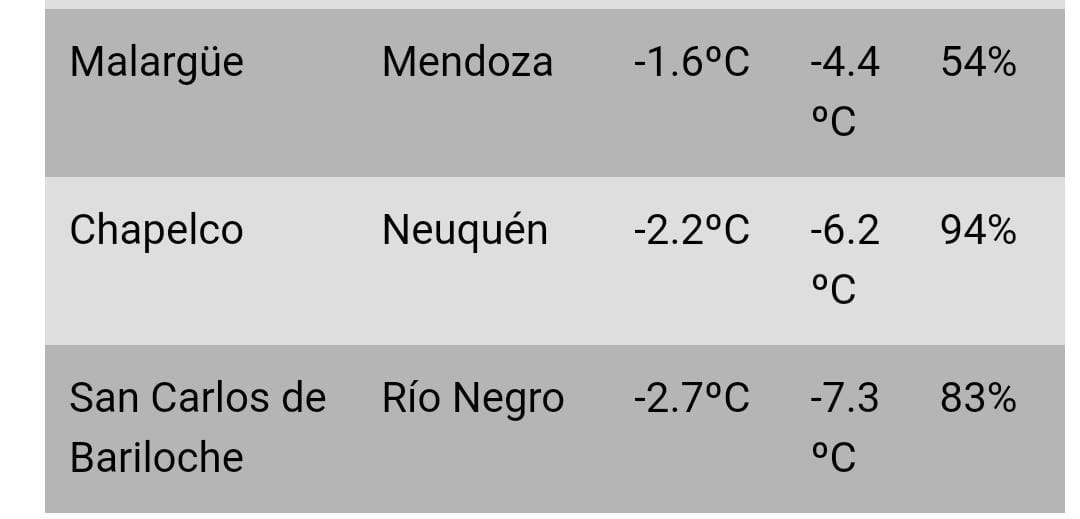 Tal es así que ayer se notó en Malargüe un marcado descenso y hoy el departamento sureño comenzó la jornada con gélidas temperaturas. En este sentido, según el registro de la hora 6 del Servicio Meteorológico, el termómetro marcó 1.6°C bajo cero y 4.4°C bajo cero de sensación térmica. Con estos números Malargüe se ubicó como la tercera ciudad más fría del país, según el ranking del SMN.