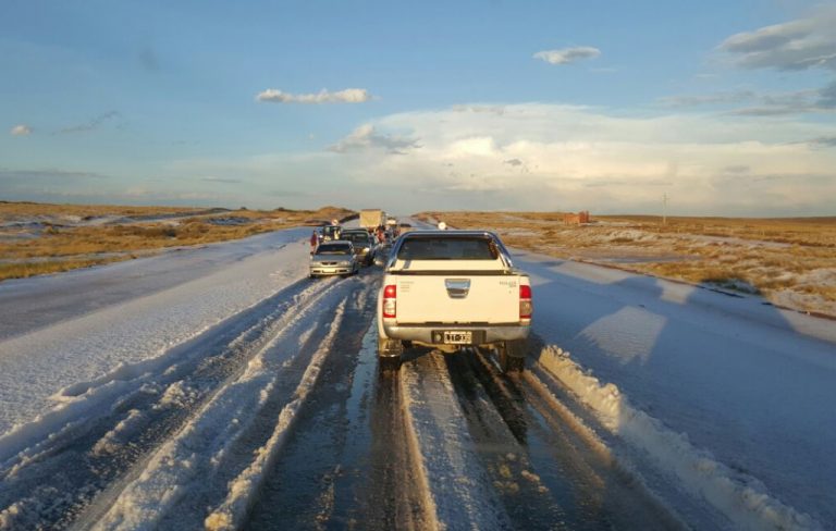 Producto de la contingencia climática la ruta 144, que une a los dos departamentos sureños, quedó totalmente cubierta de granizo, lo que ocasionó que algunos vehículos derraparan.