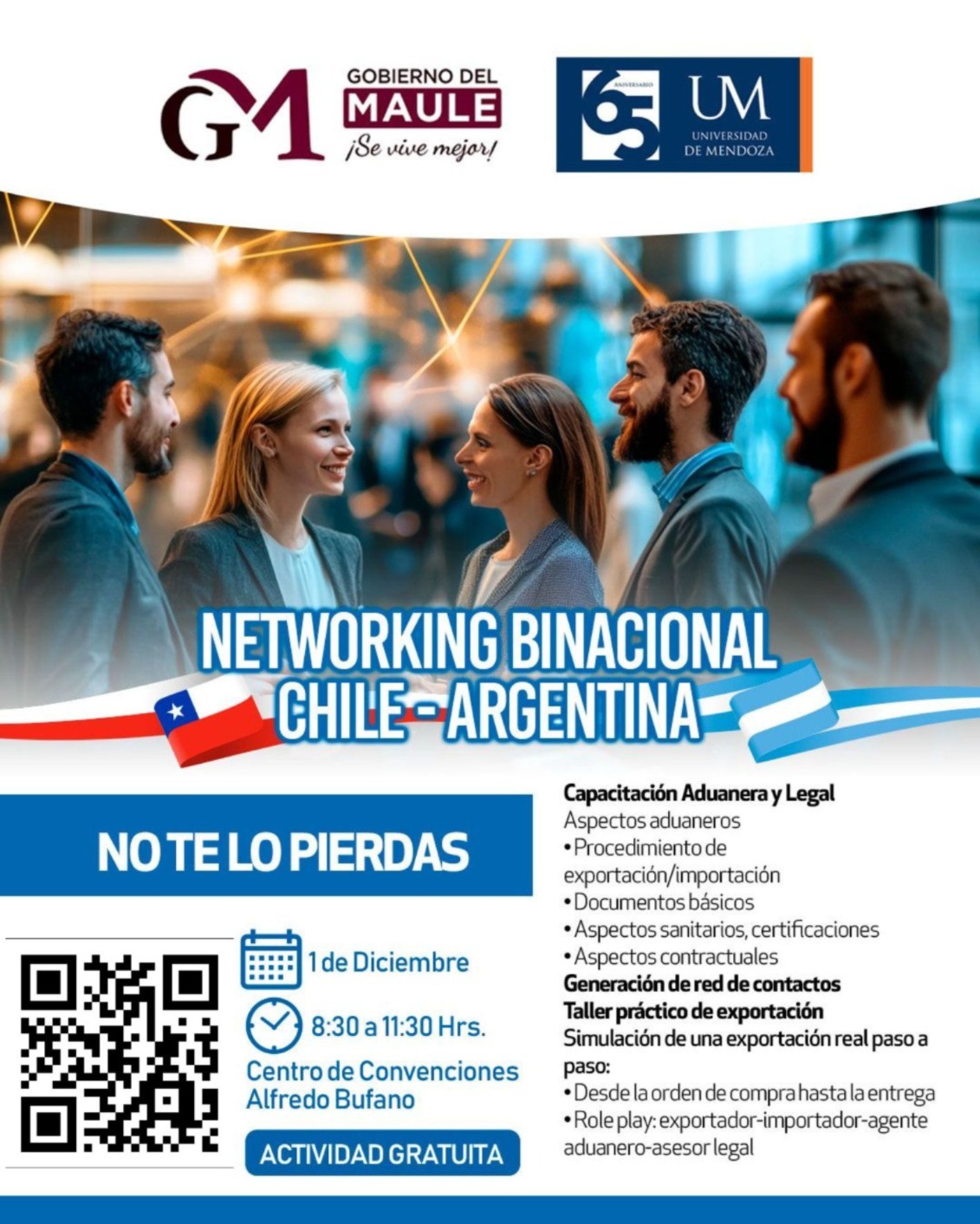- Networking y capacitación (1 de diciembre): El lunes se realizará una actividad gratuita organizada en conjunto con la Universidad de Mendoza en el Centro de Convenciones Alfredo Bufano. El objetivo es generar una red de contacto entre chilenos y argentinos, ofreciendo capacitaciones sobre exportación, talleres prácticos y lineamientos para «abrirnos al mundo».